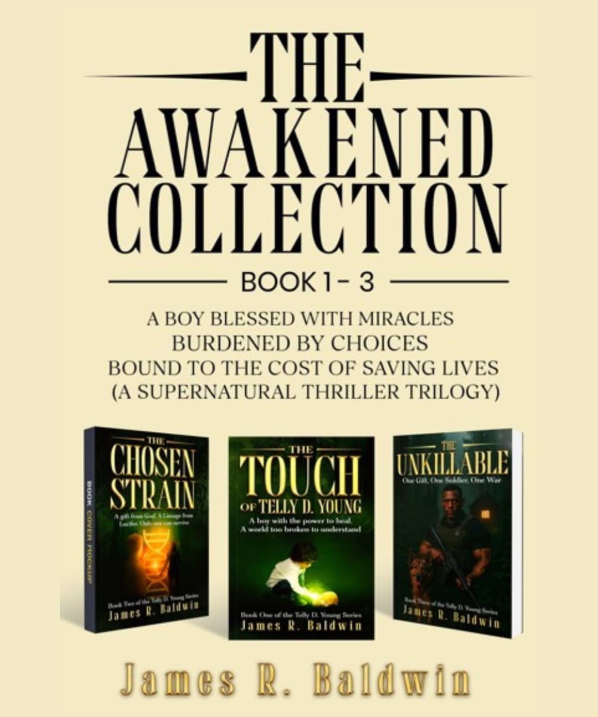 The Awakened Collection Christian Fiction bookbrings together the First three gripping science Fiction mystery thriller suspense novels,The Touch of Telly D. Young, The Unkillable, and The Chosen Strain, in a sweeping saga of faith, sacrifice, and impossible choices, where every act of healing blurs the line between miracle and curse, and one haunting question rises above them all: